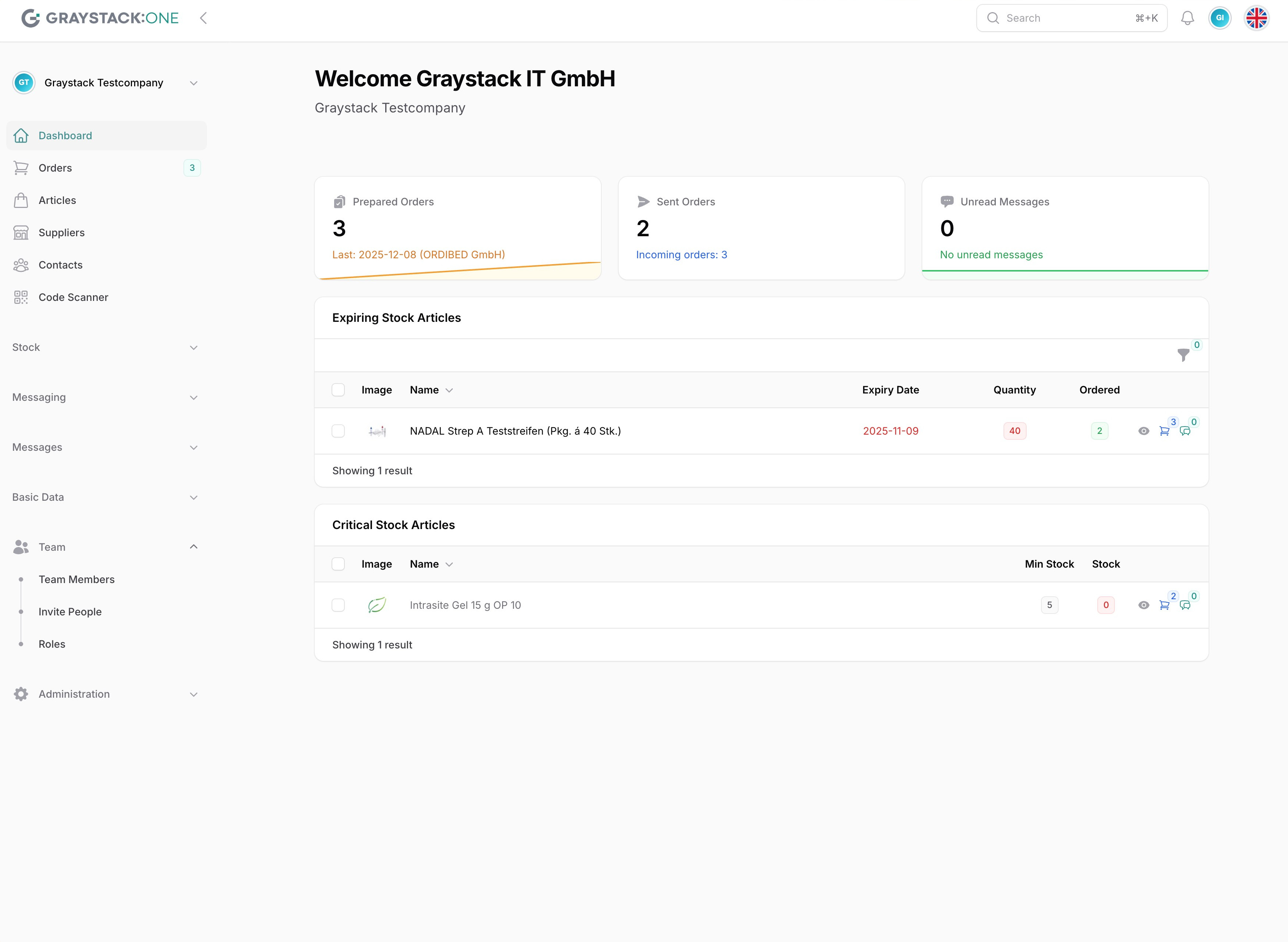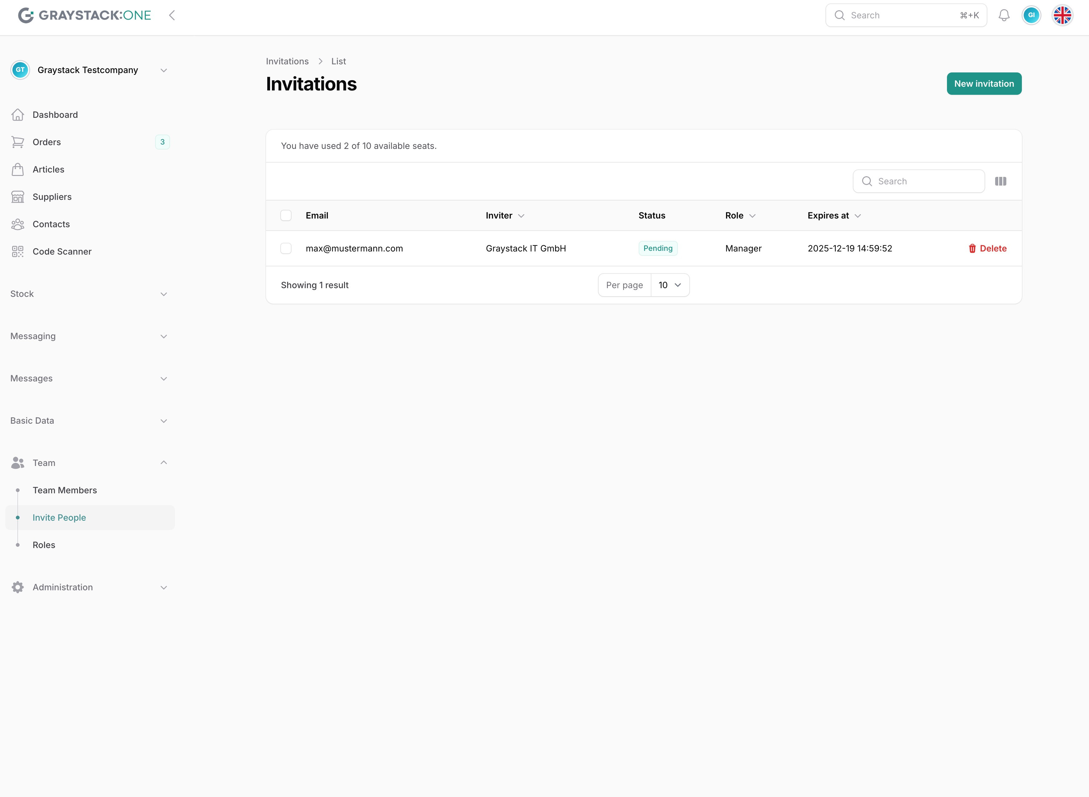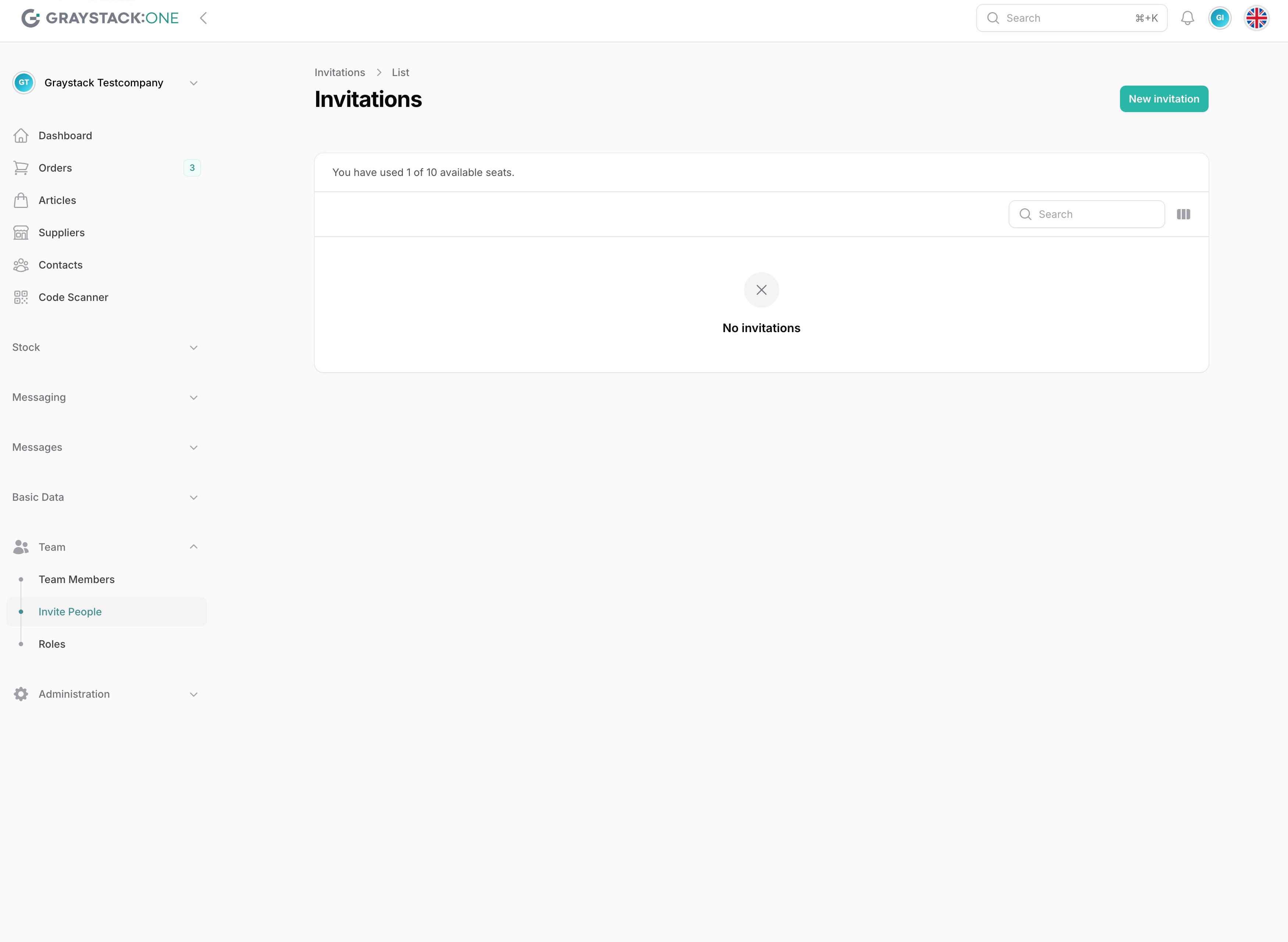 Um ein neues Teammitglied einzuladen, öffnen Sie zunächst Graystack:One und melden Sie sich in Ihrem Konto an. Gehen Sie dann im Hauptmenü auf der linken Seite zu 'Team' und klicken Sie auf 'Einladen'. Dies öffnet den Einladungsbereich.