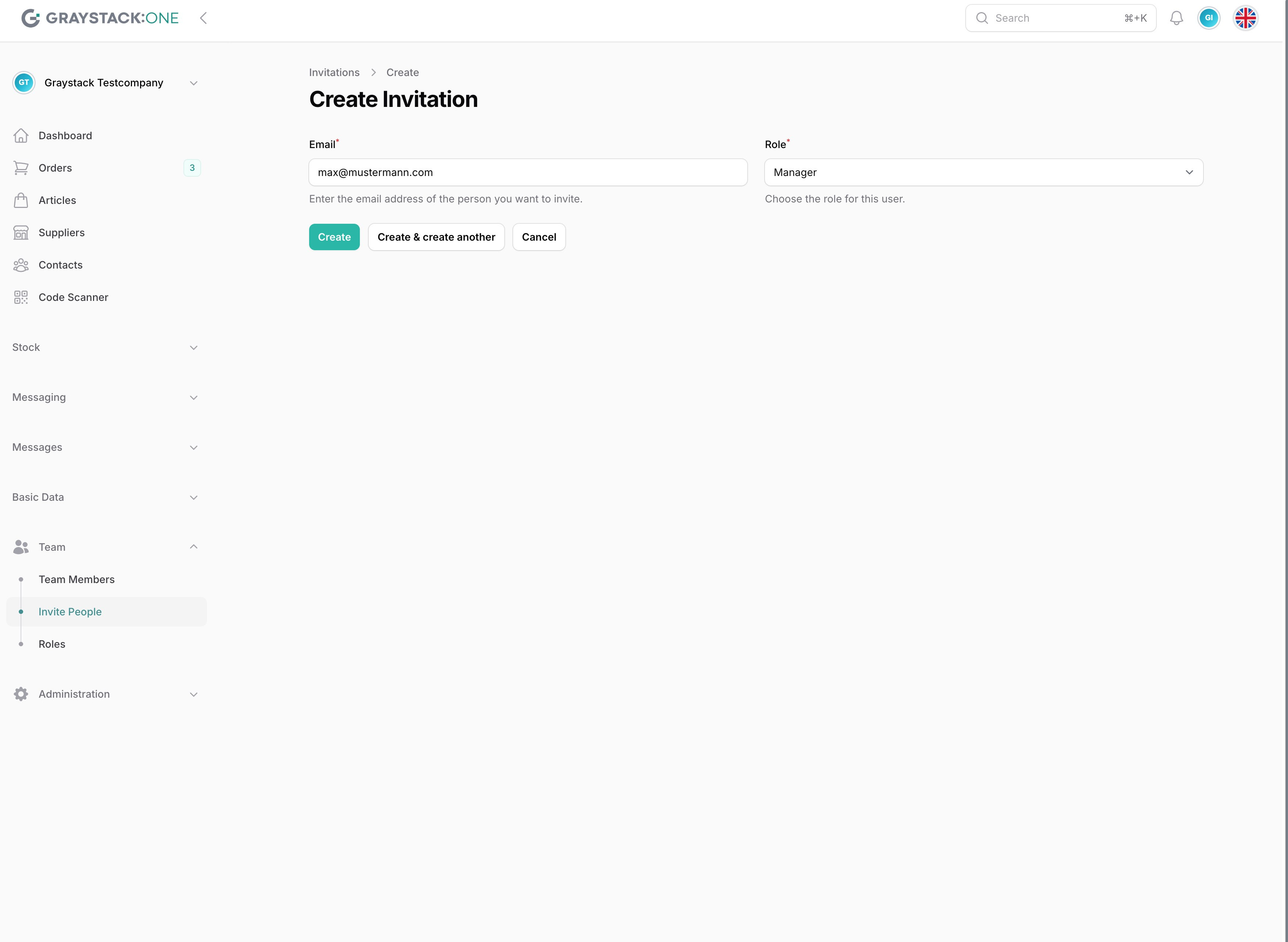 Nachdem Sie die E-Mail-Adresse und die Rolle eingegeben haben, klicken Sie auf 'Erstellen', um die Einladung abzuschließen. Das neue Teammitglied erhält eine E-Mail mit einem Link zur Annahme der Einladung.