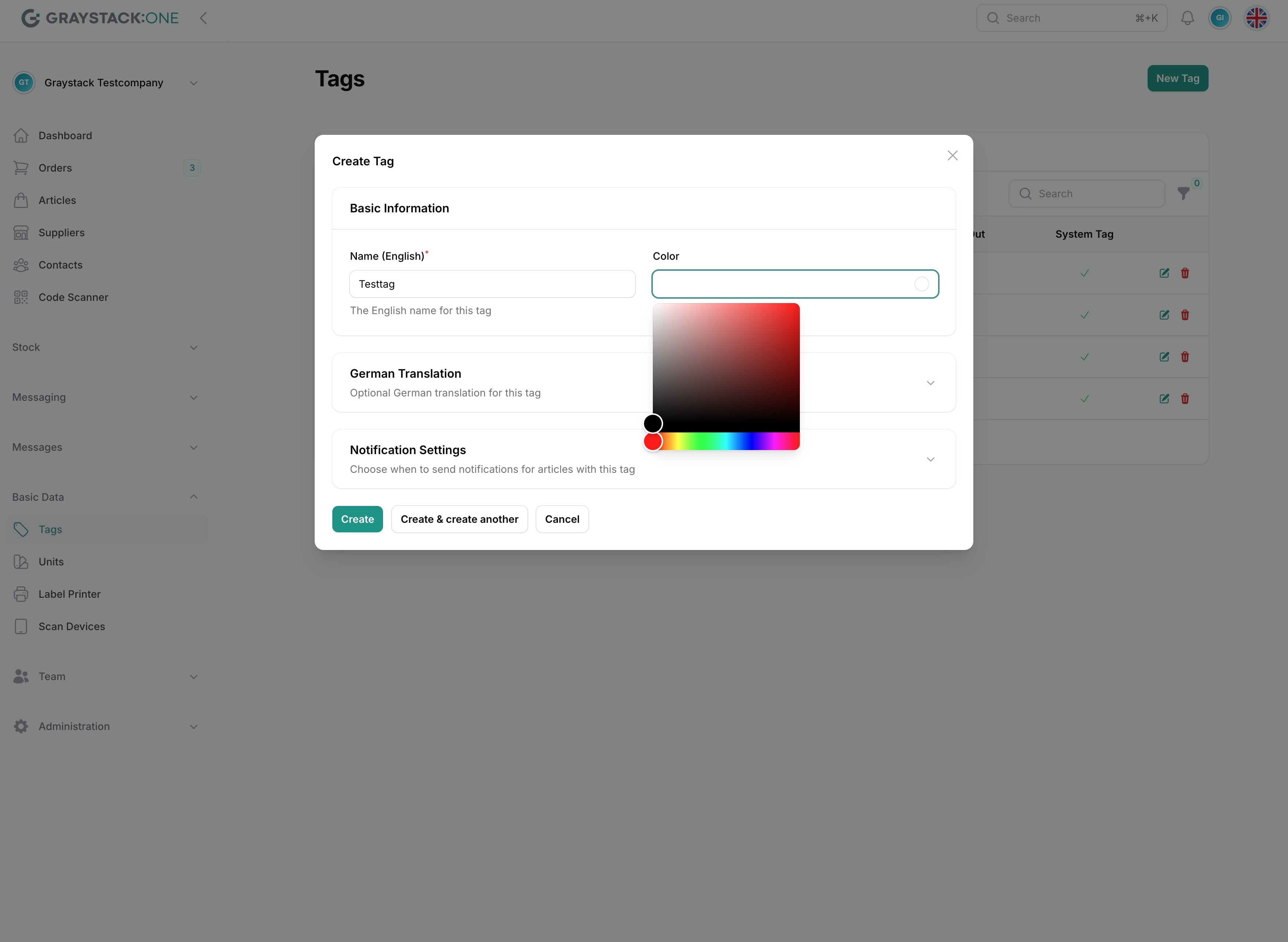 Geben Sie im Erstellungsfenster den Namen des Tags ein und wählen Sie eine Farbe. Optional können Sie eine deutsche Übersetzung hinzufügen.