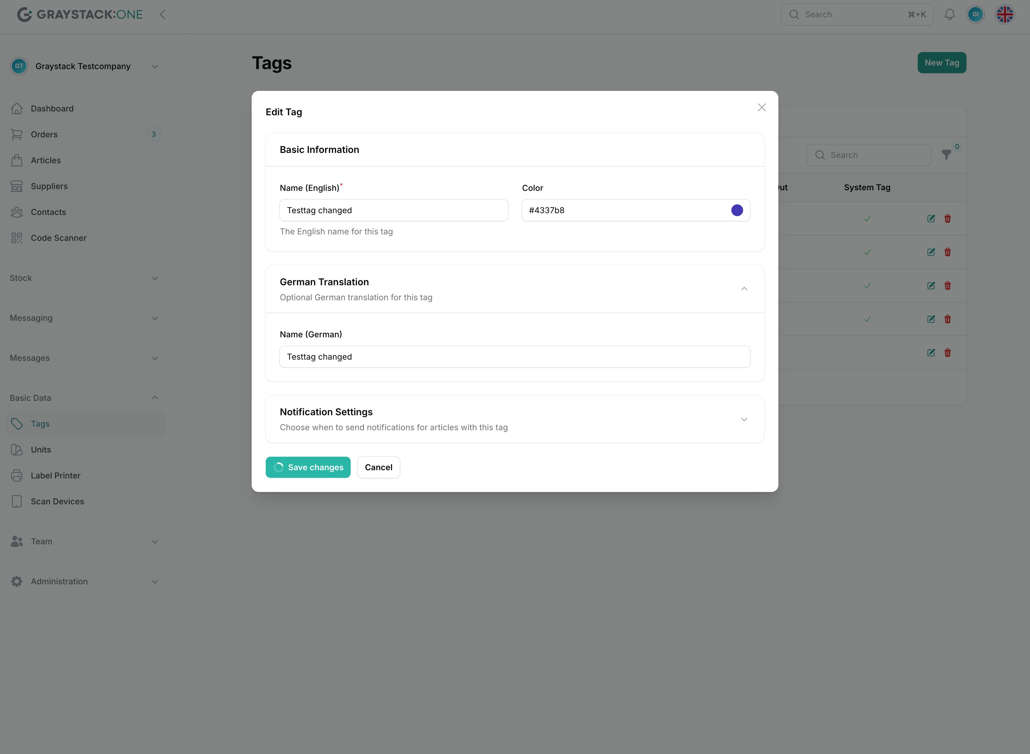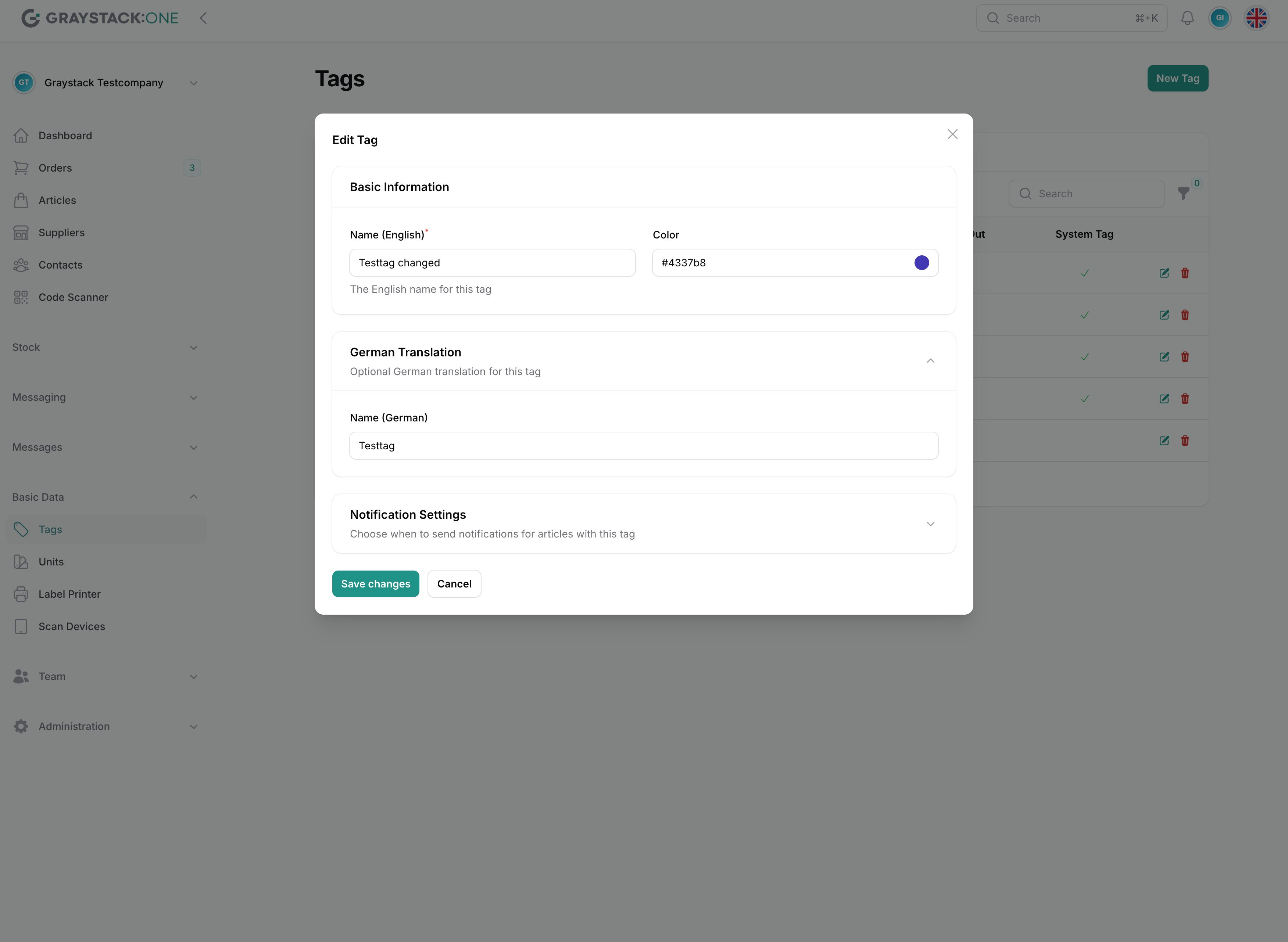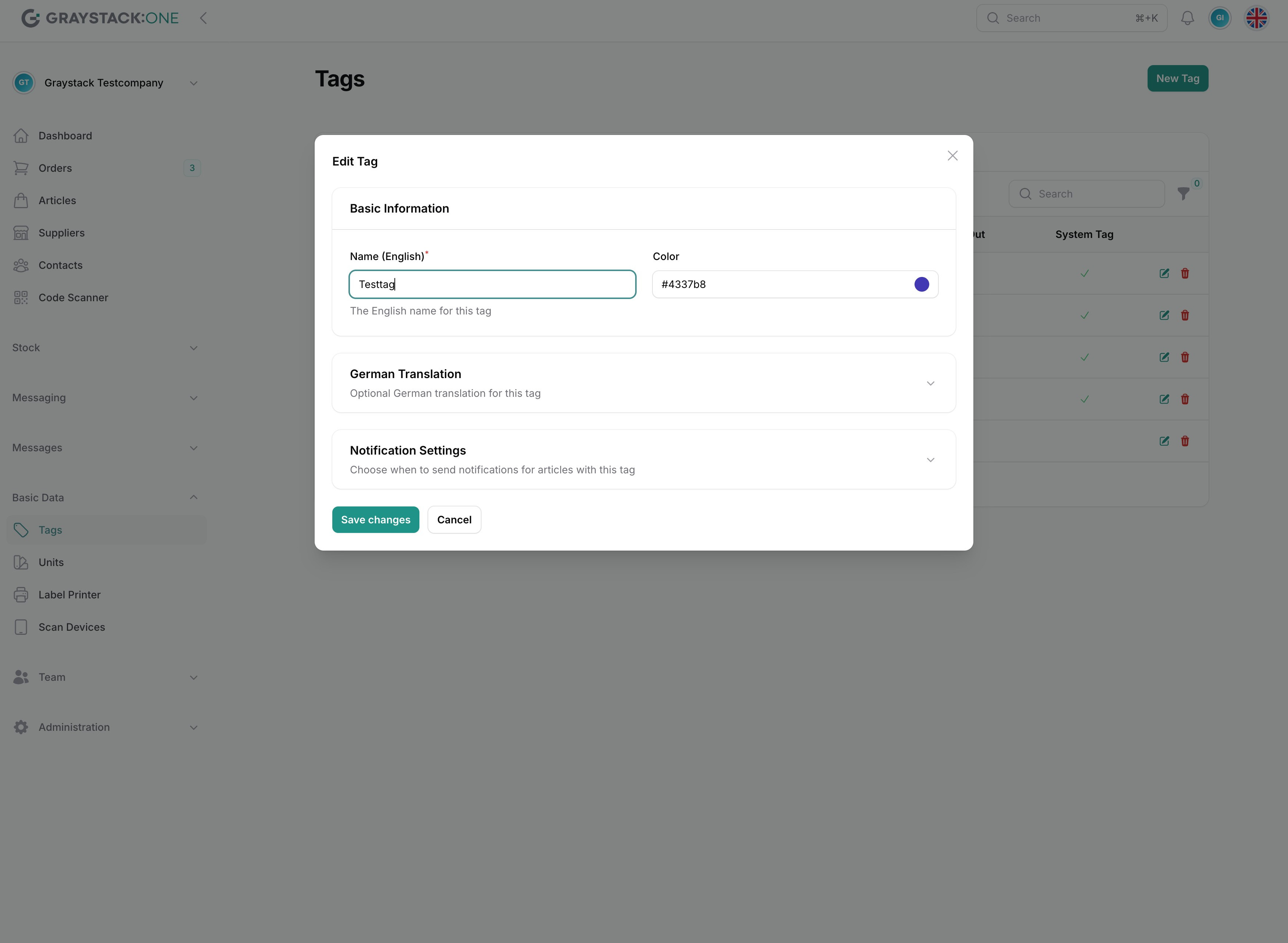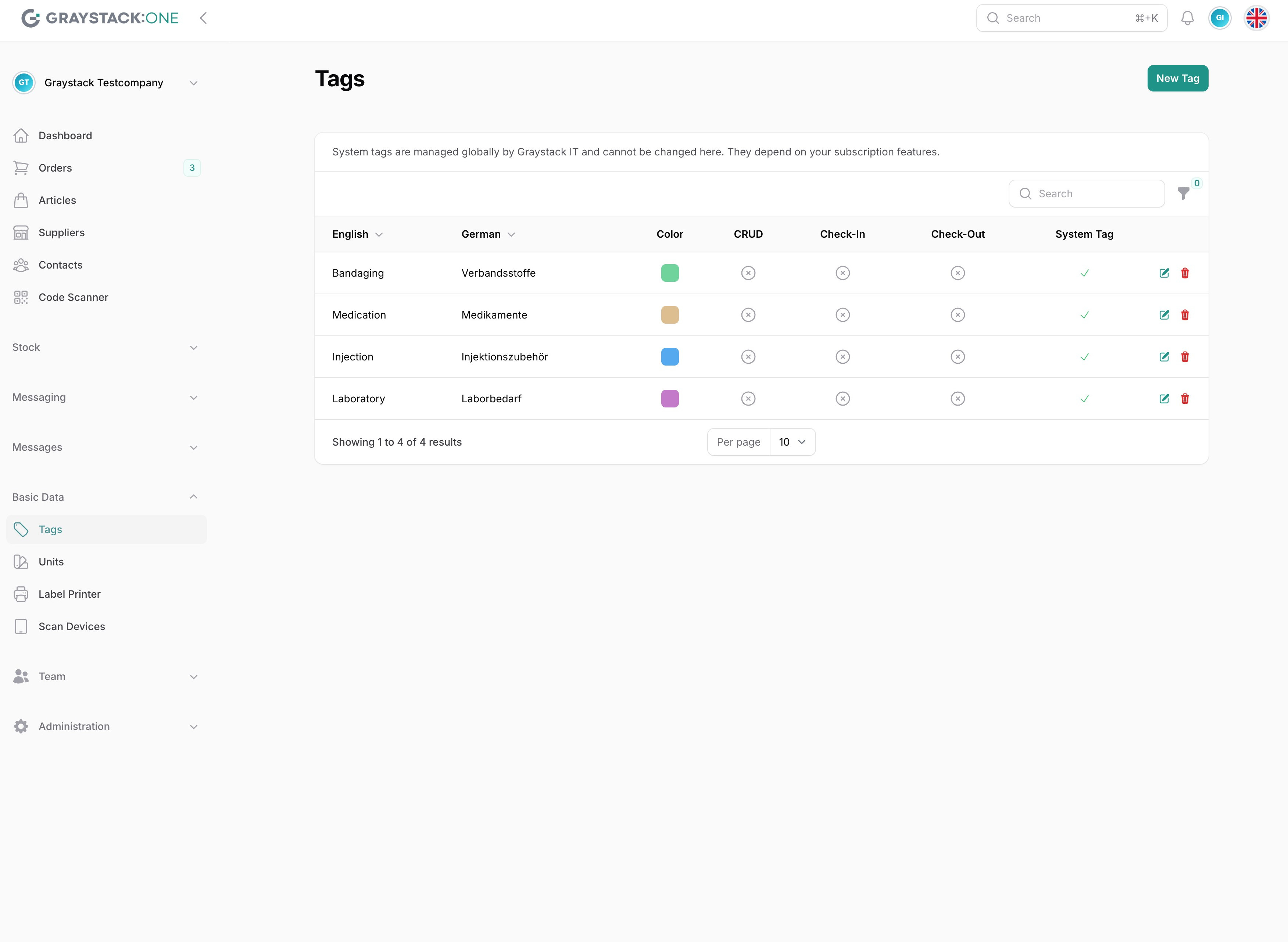 Achtung: System-Tags können nicht bearbeitet werden! Diese werden von Graystack:One vorgegeben und können für Artikel verwendet, aber nicht geändert werden.