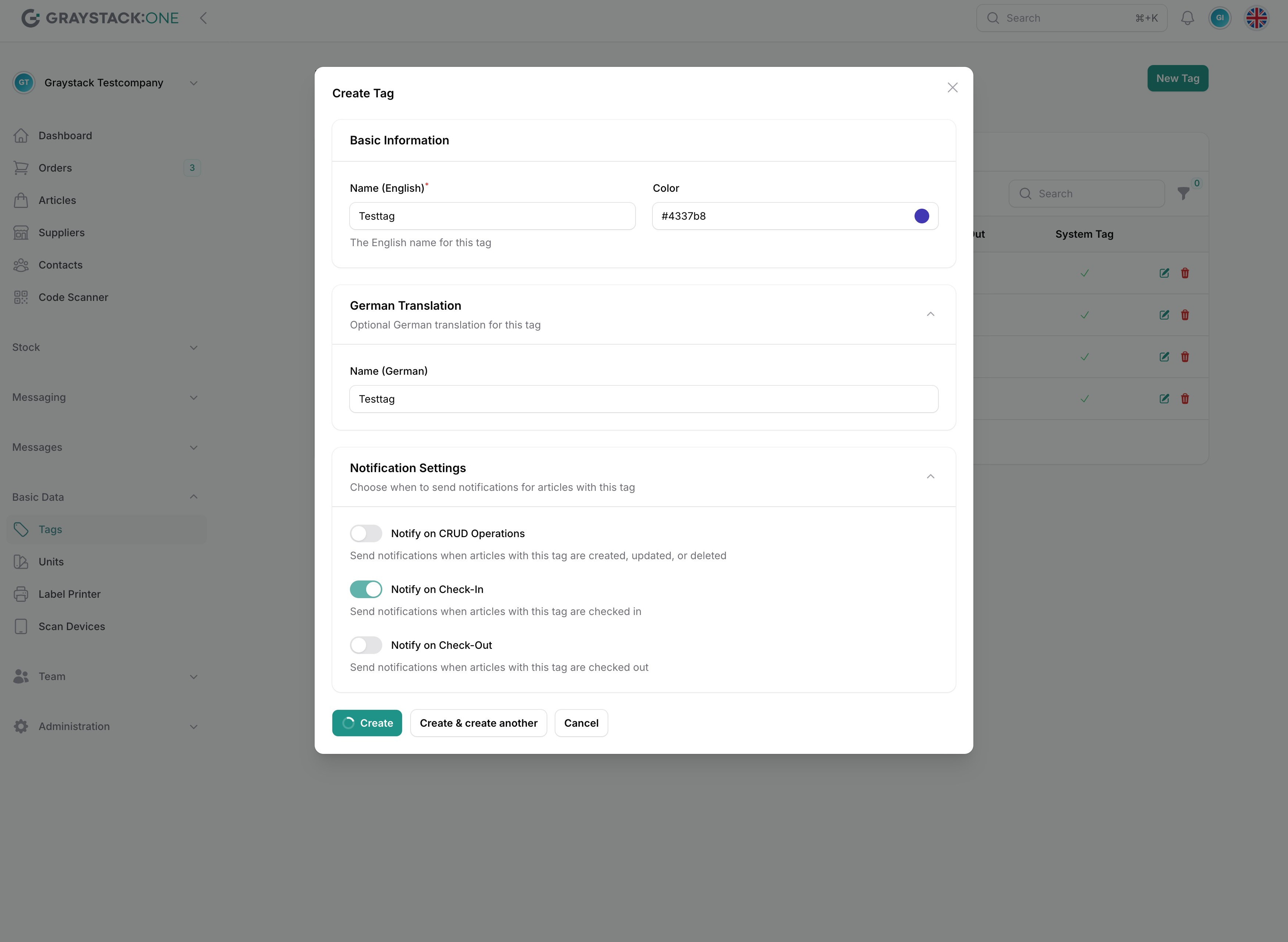 Klicken Sie auf 'Create', um das Tag zu speichern, oder auf 'Create & create another', um ein weiteres Tag hinzuzufügen.