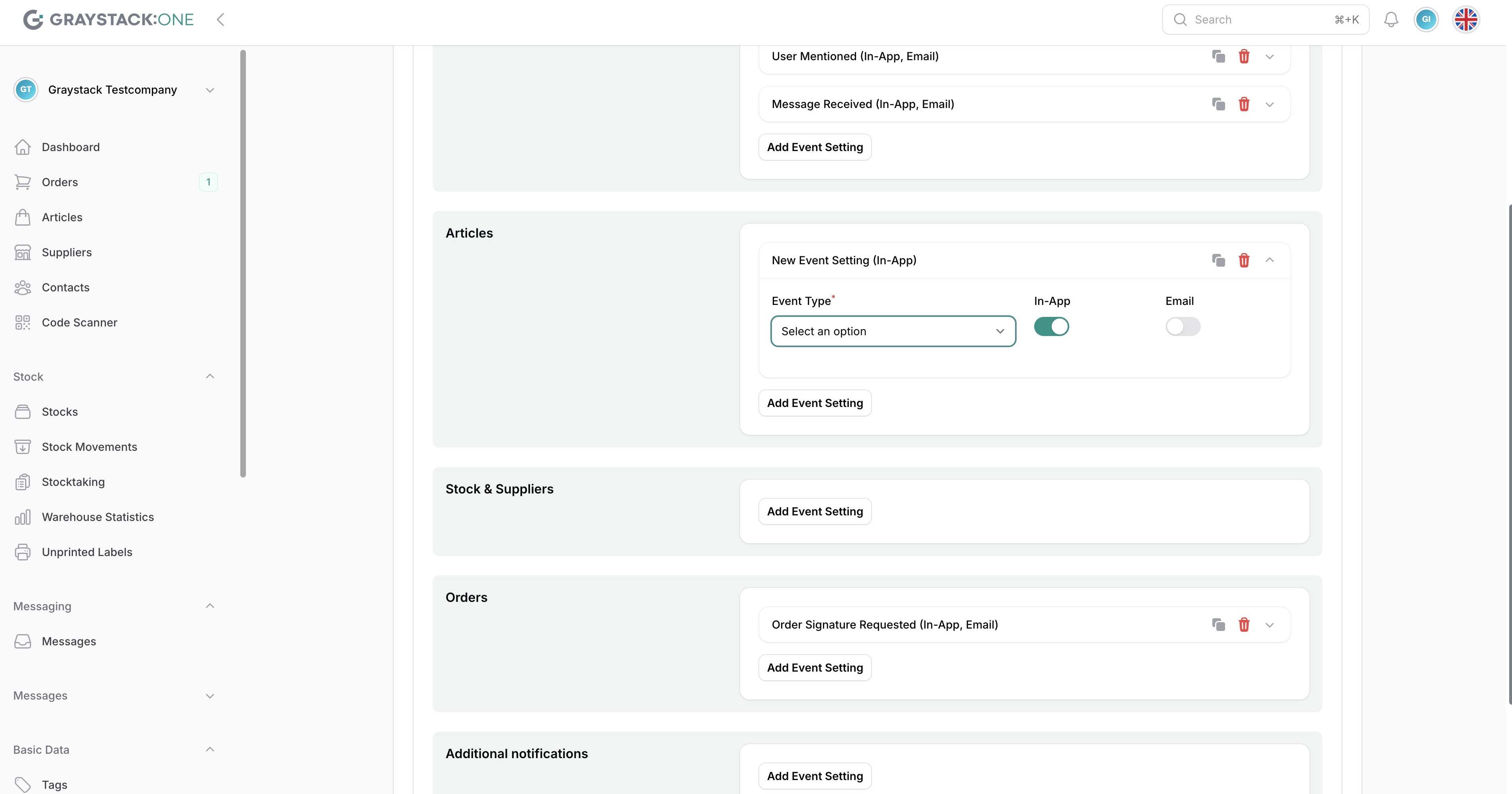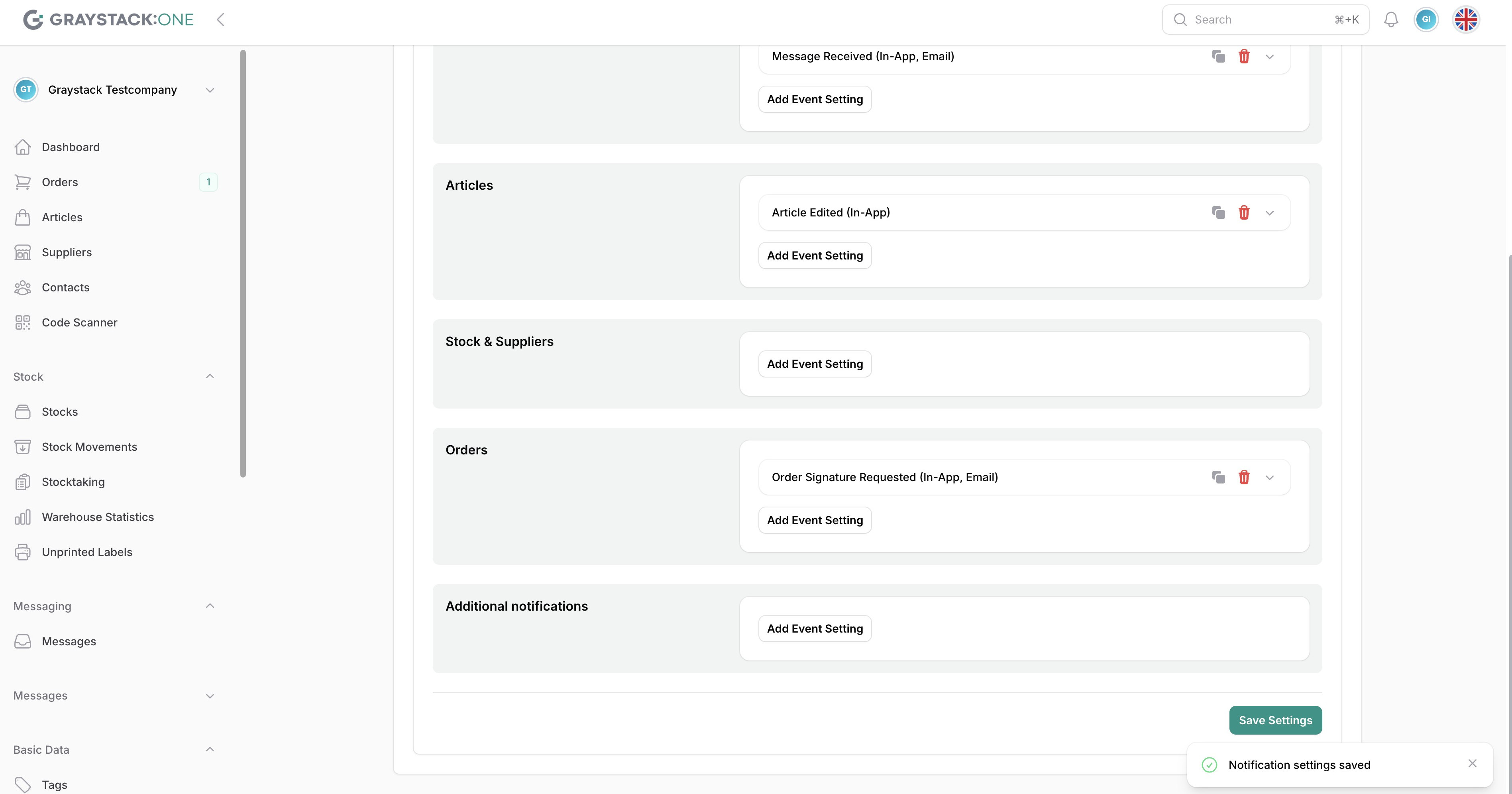 In diesem Artikel erfahren Sie, wie Sie die Benachrichtigungseinstellungen in Graystack:One anpassen können, um über wichtige Ereignisse informiert zu bleiben. Diese Funktion ermöglicht es Ihnen, Benachrichtigungen nach Ihren individuellen Bedürfnissen zu konfigurieren.