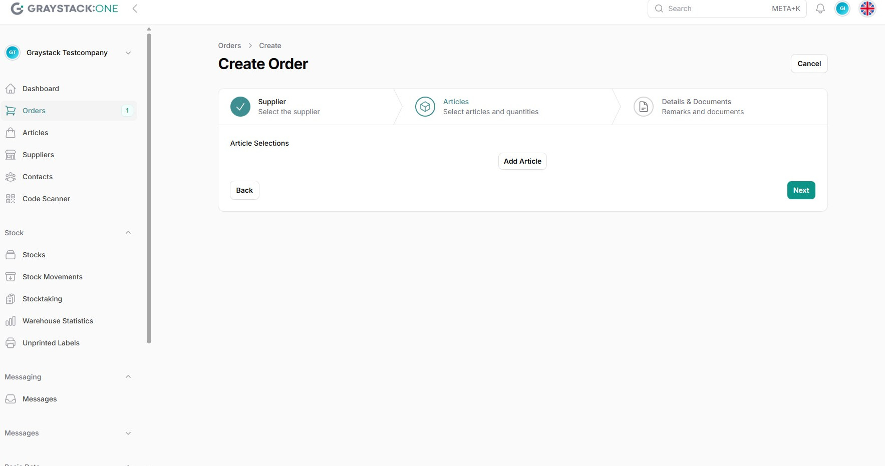 After selecting the supplier, you can add items to the order. Click on "Add Article" to choose items from the list.