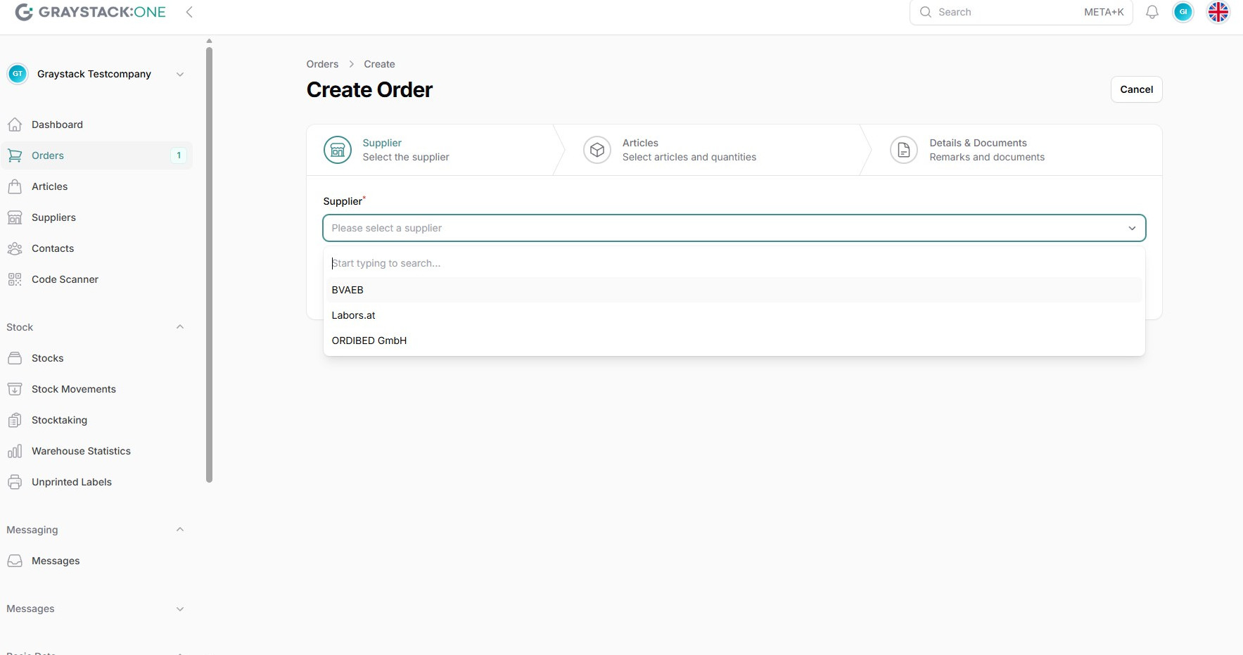 Click on "New Order" to start the ordering process. You will be prompted to select a supplier.